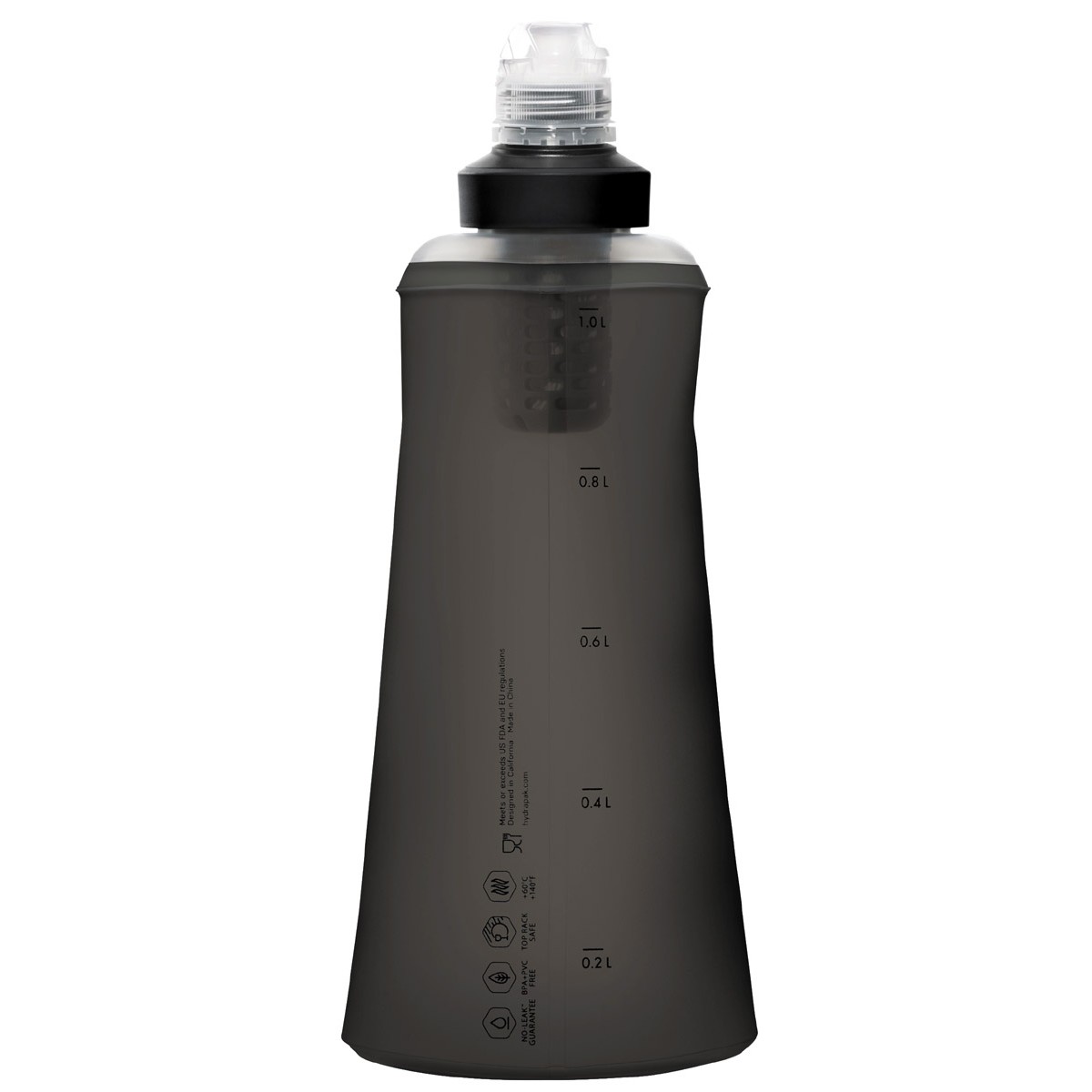Bottiglia filtrante per l'acqua altamente funzionale, compatta, leggera, e performante. La bottiglia ha una capacità di 1 litro d'acqua e, se non è piena, può essere riposta facilmente in tasca. L'unico componente fisso è il filtro con beccuccio, che è avvitato al collo della bottiglia e può essere facilmente rimosso. Una bottiglia può quindi essere utilizzata da più persone, ciascuna con il proprio filtro e beccuccio. Il filtro è in grado di purificare 2 litri d'acqua al minuto. Grazie al collo largo (42 mm), la bottiglia può essere riempita facilmente con una bottiglia d'acqua.