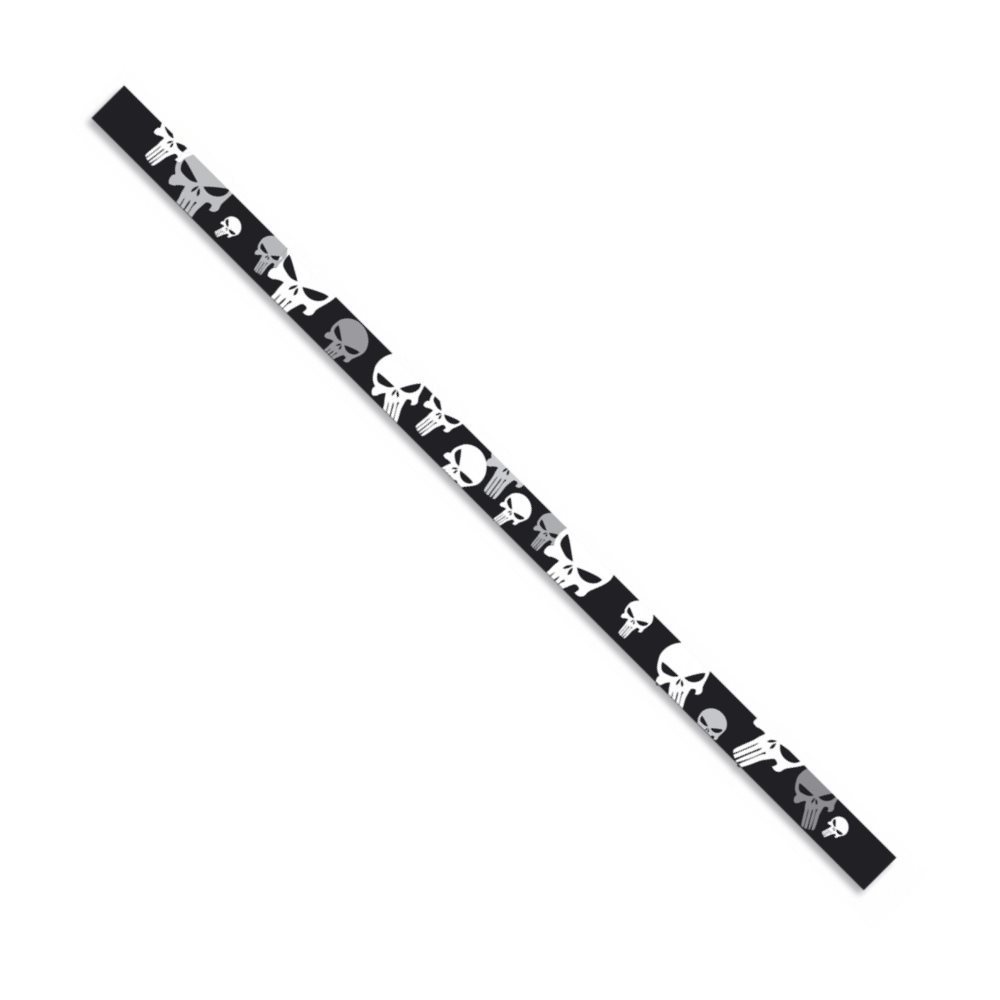 Bracciale con stampa di teschi (punisher), progettato per essere annodato o chiuso con un fermaglio in plastica (non incluso). Si tratta di una striscia di tessuto senza chiusura. Pertanto, può essere utilizzato anche come nastro decorativo da legare allo zaino, al gilet, come tiretto della cerniera, ecc. Allo stesso modo, può servire come identificativo del vostro bagaglio o dell'attrezzatura, se viaggiate in un gruppo numeroso e le borse, gli zaini o le valigie potrebbero essere scambiati.