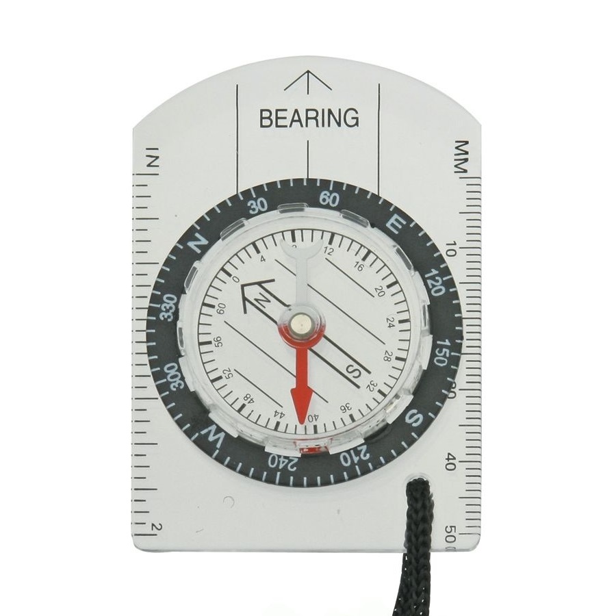 che consente di determinare i punti cardinali, e un goniometro girevole, che permette di misurare l'azimut. Il righello serve per leggere le distanze sulle mappe di diverse scale. Il cordino può essere infilato nel foro nell'angolo della bussola e utilizzato per appendere la bussola al collo.
