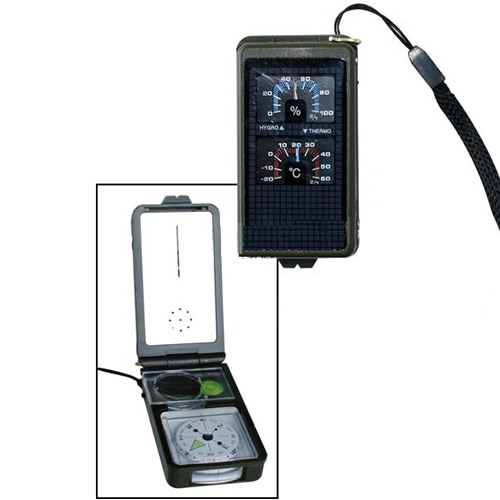 Include bussola, igrometro, termometro, specchio di segnalazione, torcia LED, livella, accendino, fischietto e lente d'ingrandimento con righello. Materiale: plastica. Dimensioni: 70 x 39 x 25 mm. Ulteriori informazioni