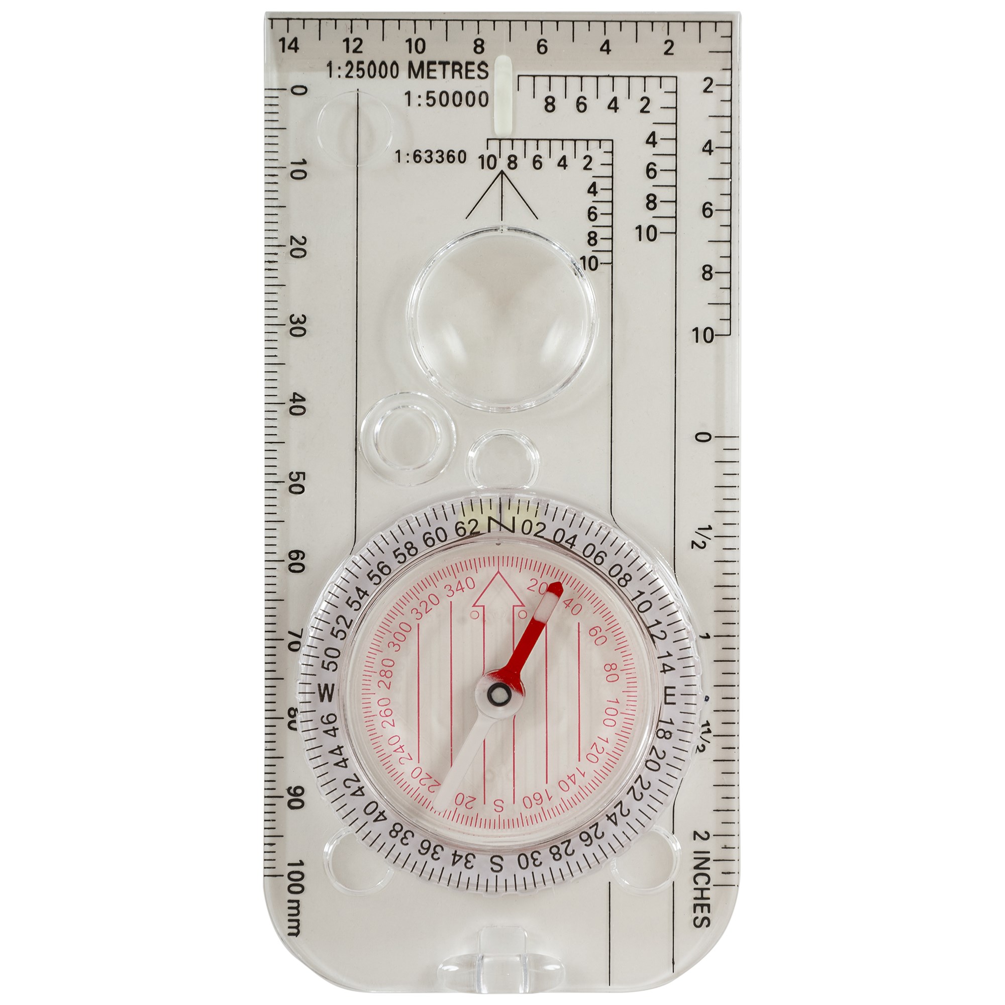 Bussola in plastica leggera con scale 1:25000, 1:50000, 1:63360, righello in mm su un lato e in pollici sull'altro. Include lente di ingrandimento e indicatore fluorescente. Dimensioni della bussola: 125 x 60 mm. Ulteriori informazioni