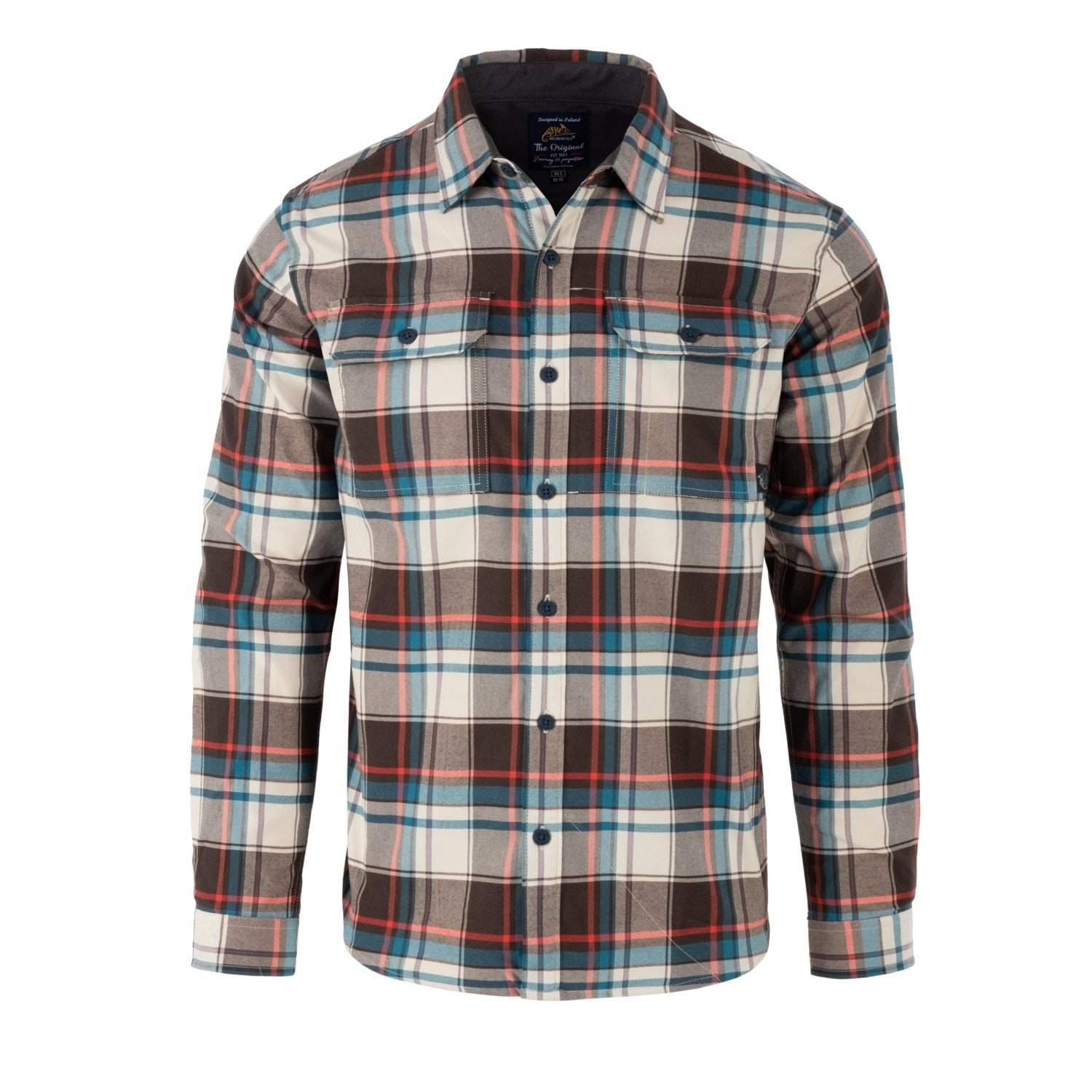 La camicia si chiude con bottoni in plastica resistenti. Sul petto sono presenti due tasche profonde chiuse da una patta con bottone. Queste tasche dispongono inoltre di un piccolo passante per appendere gli occhiali. All'interno è presente una piccola tasca nascosta con chiusura a zip, adatta per riporre oggetti di valore. Oltre alla tasca interna, è presente un piccolo pannello di tessuto morbido destinato alla pulizia degli occhiali.