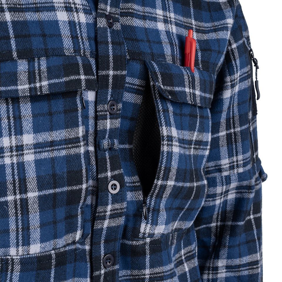 La camicia è dotata di bottoni resistenti. Sul petto sono presenti tasche profonde con chiusura a patta e velcro. Sotto queste tasche si trovano altre due tasche nascoste. Sono accessibili tramite cerniere verticali, possono contenere senza problemi smartphone di qualsiasi dimensione e sono foderate con una morbida rete. Su entrambe le maniche sono presenti ampi pannelli in velcro, destinati alle vostre toppe VELCRO. Sotto i pannelli si trovano tasche con chiusura a zip, in cui sono riposti dei lacci con bottone. Questi possono essere utilizzati per fissare le maniche arrotolate. Se si portano spesso con sé gli occhiali, apprezzeranno sicuramente il semplice occhiello che serve per appenderli.