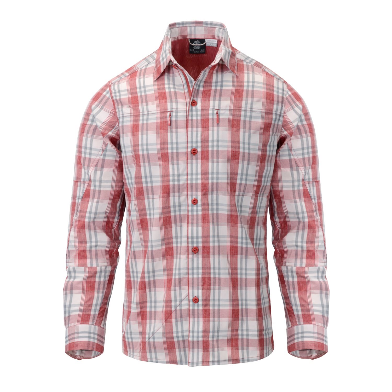 La camicia ha un taglio ben studiato ed è realizzata in materiale traspirante nel classico stile a quadri. Sul petto sono presenti due tasche chiudibili con cerniera YKK®, che possono contenere oggetti come il portafoglio o il cellulare. Un ulteriore vantaggio sono i ganci per appendere gli occhiali da sole sotto le tasche sul petto. Nella parte inferiore destra interna della camicia è presente una piccola striscia di tessuto destinata alla pulizia degli occhiali. Le maniche della camicia possono essere comodamente arrotolate quando fa caldo e sono dotate di una rete sotto le ascelle per migliorare la ventilazione. Il colletto classico della camicia può essere trasformato in un colletto alto in un attimo, evitando così scottature dal sole nelle giornate estive.
