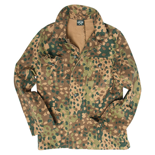 Riproduzione della giacca mimetica delle unità SS della Seconda Guerra Mondiale. Quattro tasche con patta - chiusura con bottoni. Chiusura con bottoni. Mimetizzazione: pisello. Materiale: 100% cotone. Ulteriori informazioni