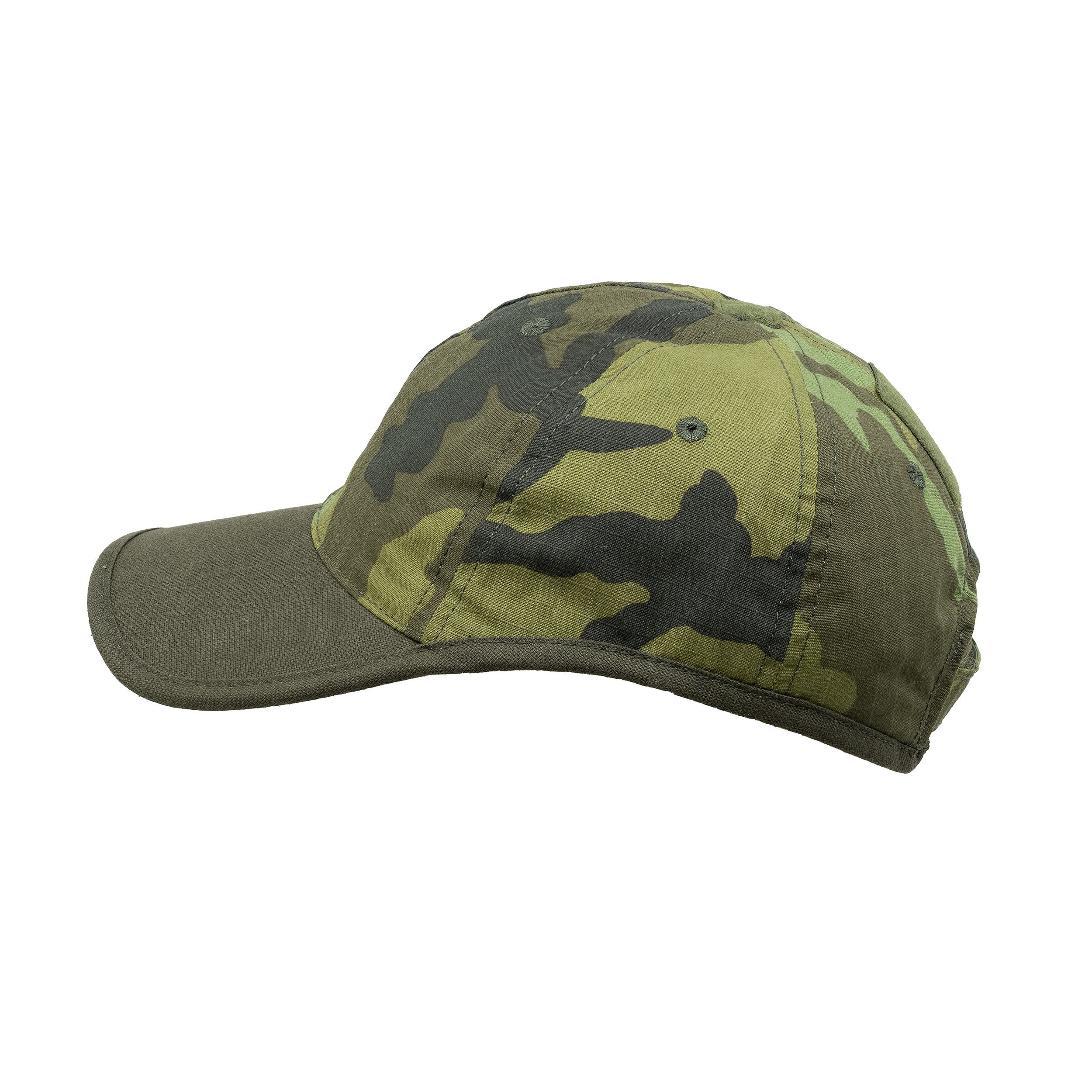 Cappellino con visiera dal taglio deciso, che si adatta perfettamente alla testa. Combinazione del motivo mimetico ceco con visiera verde scuro e bordo in tessuto grezzo. Sono presenti 6 fori di ventilazione e una fascia posteriore con chiusura in velcro per una facile regolazione della taglia. Per scopi tattici è possibile utilizzare i pannelli in velcro per le toppe con velcro: uno è cucito nella parte posteriore, l'altro nella parte superiore al centro. La visiera è realizzata in materiale resistente e mantiene molto bene la forma. Il cinturino antisudore lungo il perimetro del cappellino è un elemento standard. Il tessuto è leggero e traspirante.