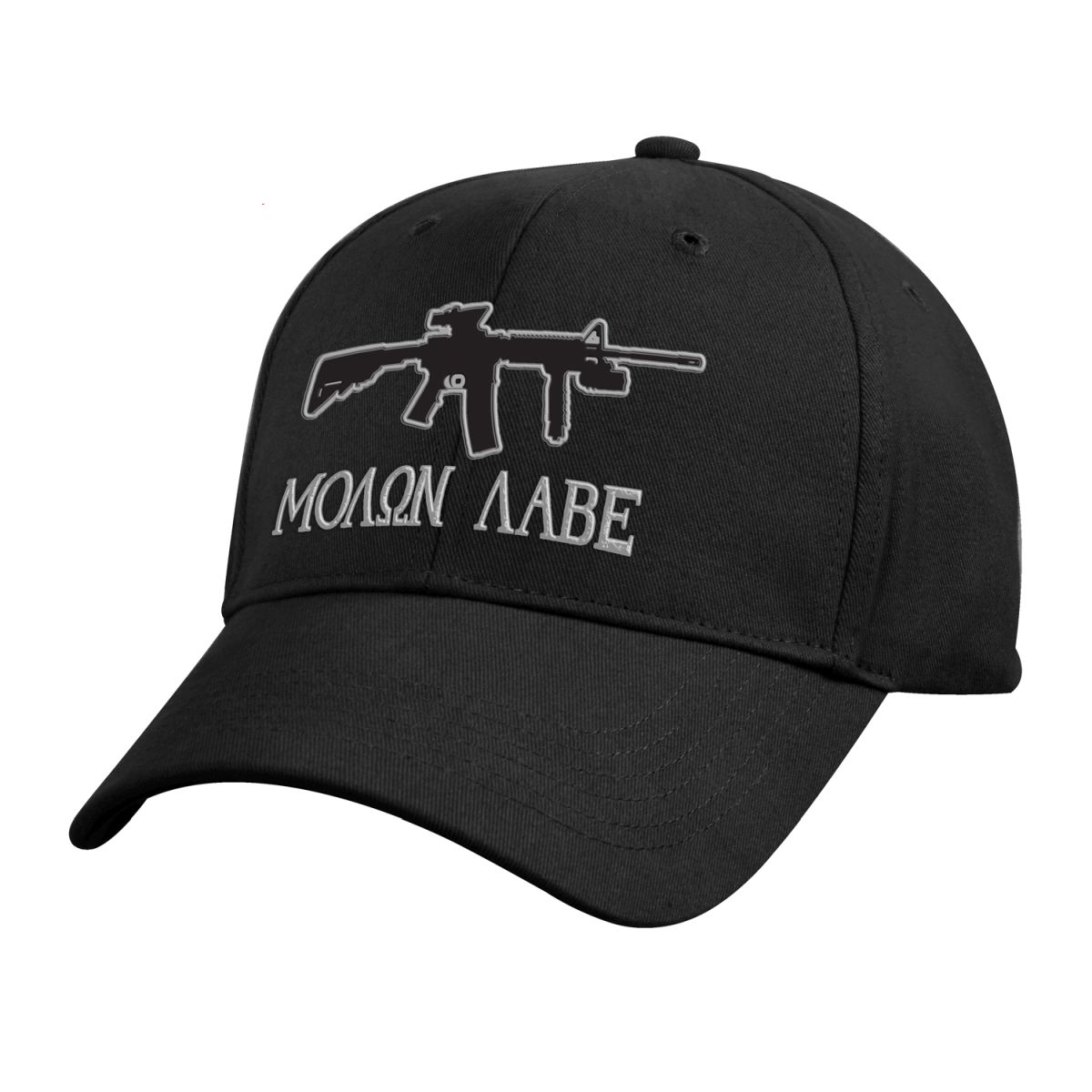 Cappellino a visiera bassa con ricamo argentato MOLON LABE e fucile. La qualità dei ricami Rothco è tradizionalmente di altissimo livello. Visiera rigida a sandwich. Taglia universale regolabile tramite cinturino in velcro.