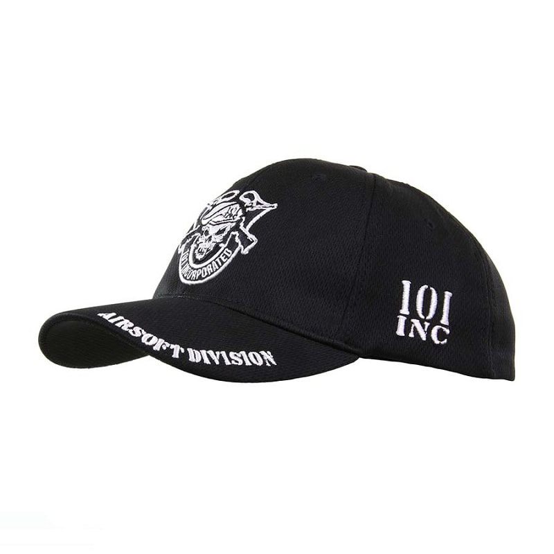 Cappellino da bambino con elastico cucito sul retro. Sulla parte anteriore del cappellino è raffigurato un teschio con un berretto (come quello delle forze speciali), fucili incrociati e la scritta Incorporated. Sulla visiera è riportata la scritta Airsoft Division, mentre sul lato del cappellino è riportata la scritta 101INC. Taglia unica.