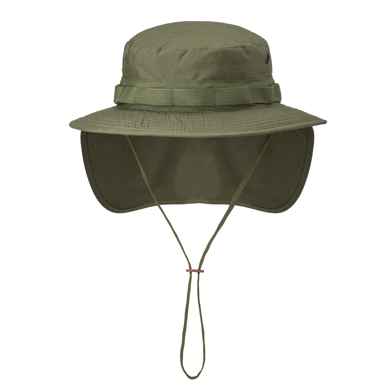 sulla parte posteriore della tesa è possibile fissare con bottoni automatici un grembiule che offre una protezione aggiuntiva dal sole, dagli insetti o un ulteriore camuffamento