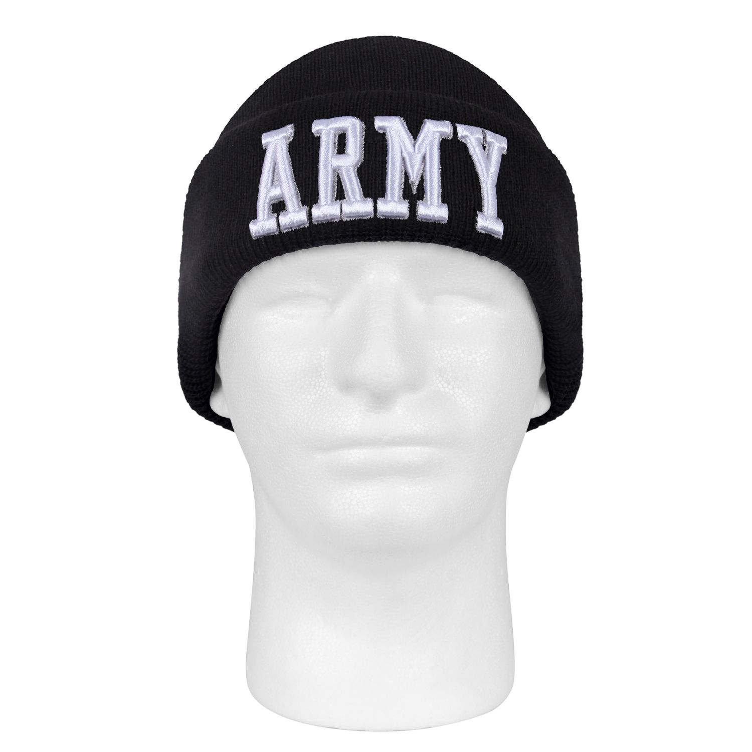 Cappello lavorato a maglia con scritta ARMY ricamata in rilievo. Altezza del cappello: circa 20 cm, altezza del bordo ricurvo: circa 7 cm.