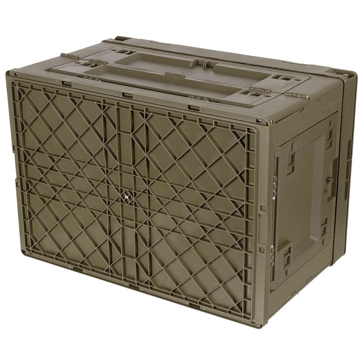 Cassa pieghevole con una capacità di 60 litri, realizzata in polipropilene resistente. La cassa è dotata di un coperchio in due parti e di accessi laterali con possibilità di chiusura a chiave. Le casse dello stesso tipo possono essere impilate una sull'altra.