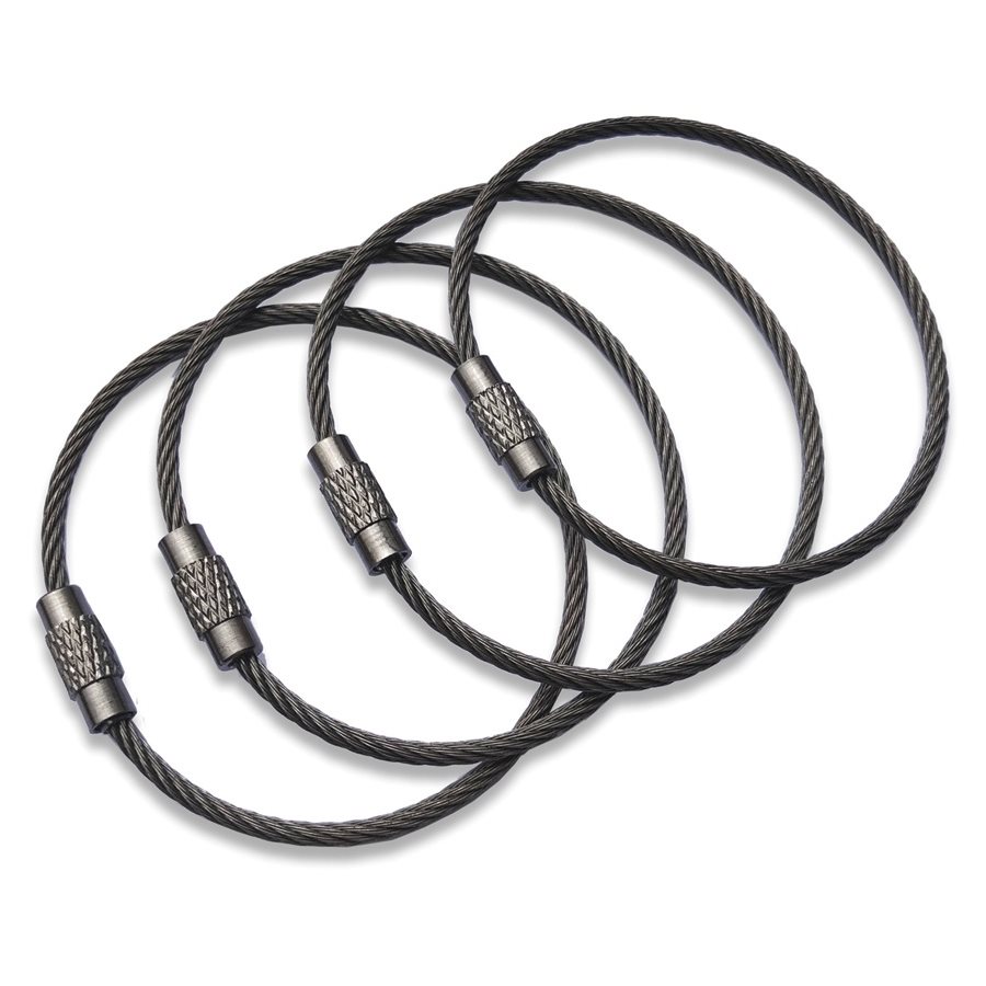 Set di cavi di sicurezza sottili con chiusura girevole. Le chiusure sono dotate di una scanalatura piuttosto pronunciata al centro, che ne facilita la manipolazione, anche con i guanti. Il pacchetto contiene 4 pezzi.