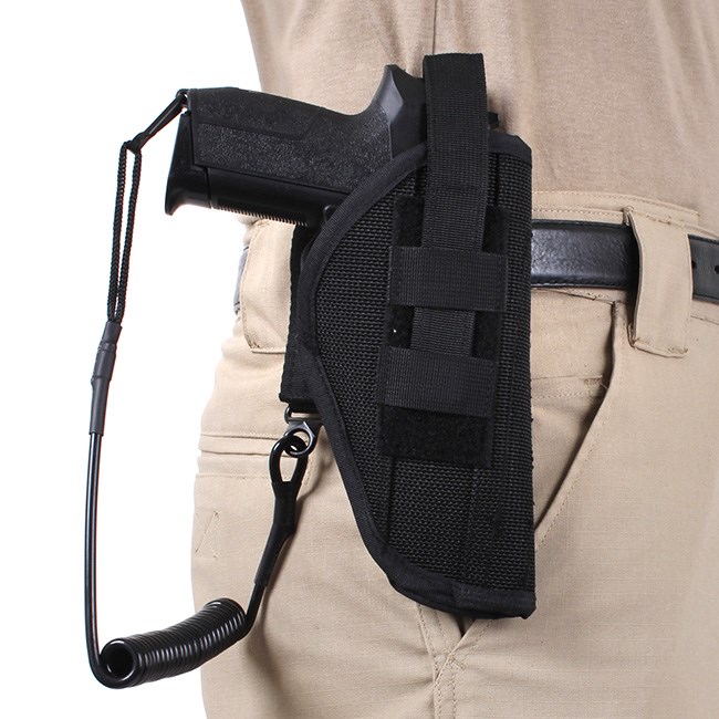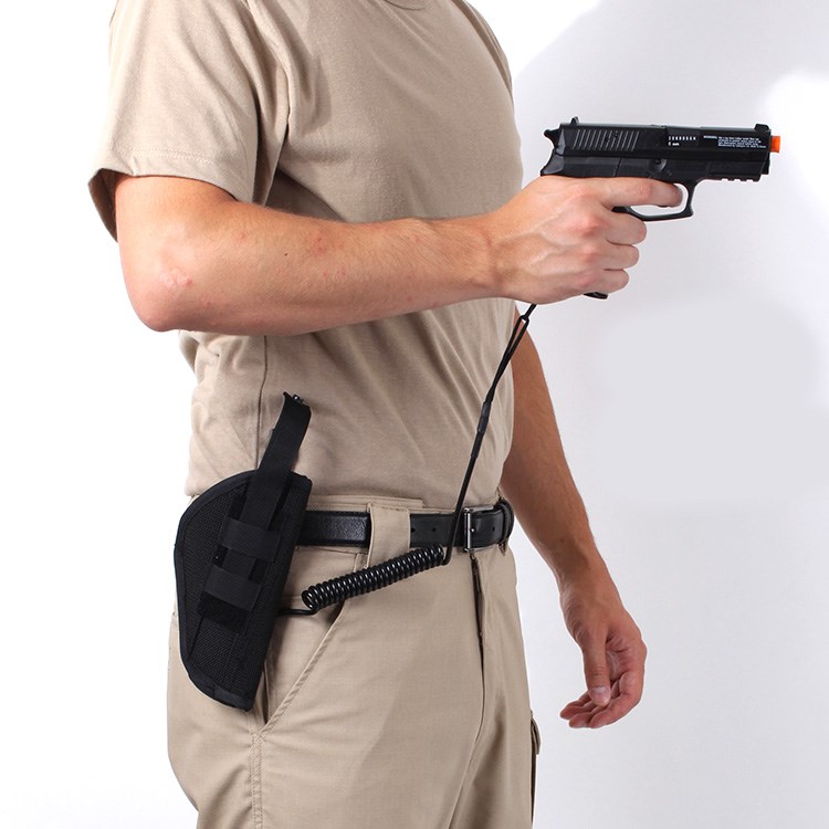 Cavo di sicurezza per armi, estendibile fino a una lunghezza di 140 cm. Può essere fissato alla cintura, alla clip, alla fondina, ecc.