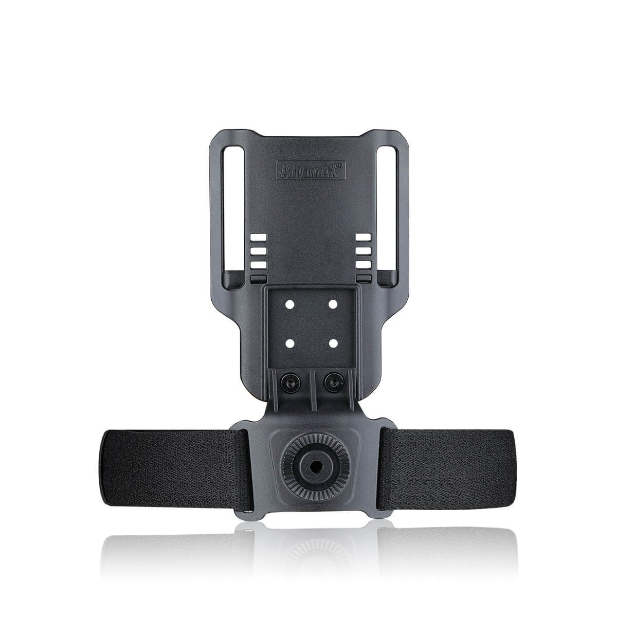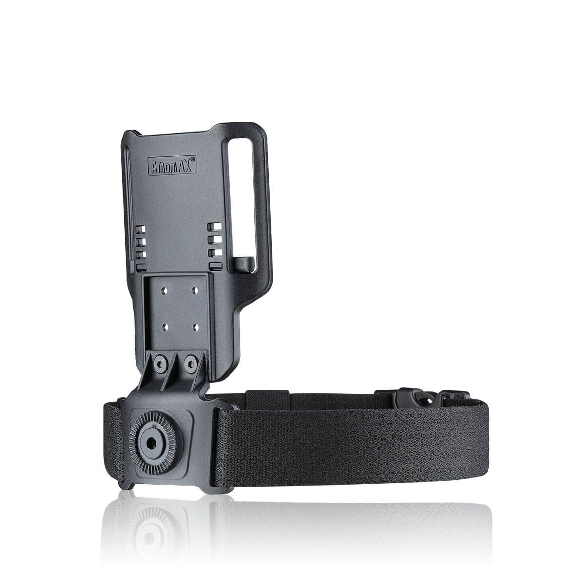 Il gancio per cintura ribassato combina la stabilità della fondina da cintura con l'ergonomia di quella da coscia. È ideale in combinazione con un giubbotto antiproiettile, che ostacolerebbe la classica fondina da cintura. È realizzato in plastica leggera e resistente, sufficientemente robusta e flessibile. Per il fissaggio sono presenti due passanti per cintura di larghezza compresa tra 38 e 63 mm. Per un migliore fissaggio alla gamba, il gancio è dotato di una cinghia elastica rimovibile con rivestimento antiscivolo. Due viti a brugola consentono di regolare la lunghezza/altezza del gancio in base alle preferenze dell'utente. L'interfaccia unificata consente di fissare qualsiasi fondina o custodia della gamma Amomax con una sola vite, con la possibilità di regolare l'inclinazione della fondina in un intervallo di 360°.
