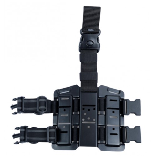 Cinghia tattica da coscia per il fissaggio di fondine in plastica per pistola del marchio Dasta o di altre fondine e tasche standard PALS / MOLLE. La cinghia è costituita da una piattaforma in plastica a cui sono fissate due cinghie elastiche da coscia e una cinghia "portante" per appendere la fondina alla cintura di servizio / da tiro. Le cinghie per coscia sono regolabili, dotate di fibbie fastex per una rapida apertura e hanno un filo di gomma intrecciato che aumenta l'attrito tra la cinghia e l'abbigliamento, impedendo così che la fondina ruoti sulla coscia dell'utente. La cinghia di trasporto è rinforzata in plastica, regolabile in lunghezza tramite velcro e dotata di fibbia Fastex con chiusura di sicurezza. Il passante per cintura ha una larghezza di circa 5,5 cm con lato interno in velcro per un fissaggio più stabile alla cintura dotata di controparte a cappio staccabile. Oltre alla fondina per l'arma, è possibile fissare alla piattaforma di plastica della sospensione, negli appositi fori, anche tasche e fondine standard PALS / MOLLE con una sola cinghia di fissaggio. Tuttavia, data la rigidità della plastica, la piattaforma non è compatibile con le tasche di tutti i produttori. Si consiglia di scegliere tasche con cinghie di fissaggio non rinforzate.