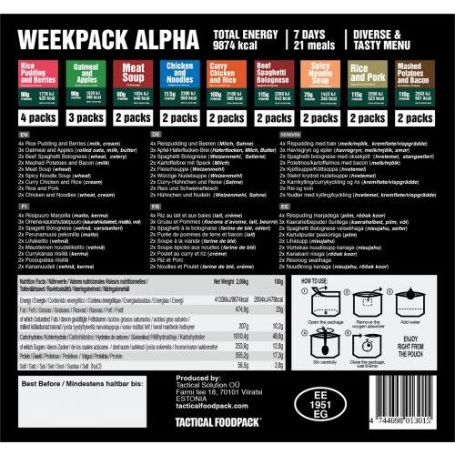 Cibo liofilizzato, leggero, energetico e nutrizionalmente equilibrato. A differenza dei comuni alimenti liofilizzati presenti sul mercato, i prodotti TACTICAL FOODPACK sono approvati per l'uso dalle forze speciali estoni e soddisfano i requisiti anche di altre forze speciali dei paesi NATO. La confezione contiene un totale di 21 porzioni e 9 varianti di piatti che vi consentiranno di rimanere in forma per tutta la settimana. Ogni pasto viene prima cucinato come un unico piatto senza l'ausilio di additivi chimici, quindi liofilizzato e inserito in una confezione richiudibile. Questo set di pasti è la scelta perfetta per alpinisti, escursionisti e militari, ma grazie alla sua lunga durata può essere apprezzato anche dai preparatori.