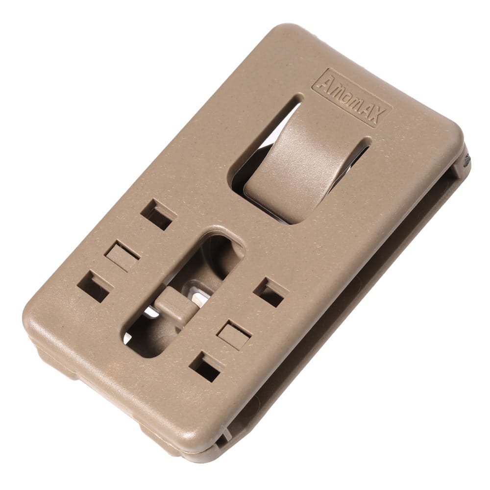 Cinghia apribile realizzata in plastica leggera e resistente. Il fissaggio avviene tramite un passante regolabile per cinture di larghezza compresa tra 38 e 63 mm. La possibilità di aprire il gancio consente di agganciarlo/sganciarlo dalla cintura senza dover smontare l'intera cintura. L'interfaccia unificata consente di fissare qualsiasi custodia o marsupio della gamma Amomax con una sola vite, regolando l'inclinazione della custodia di 360°.