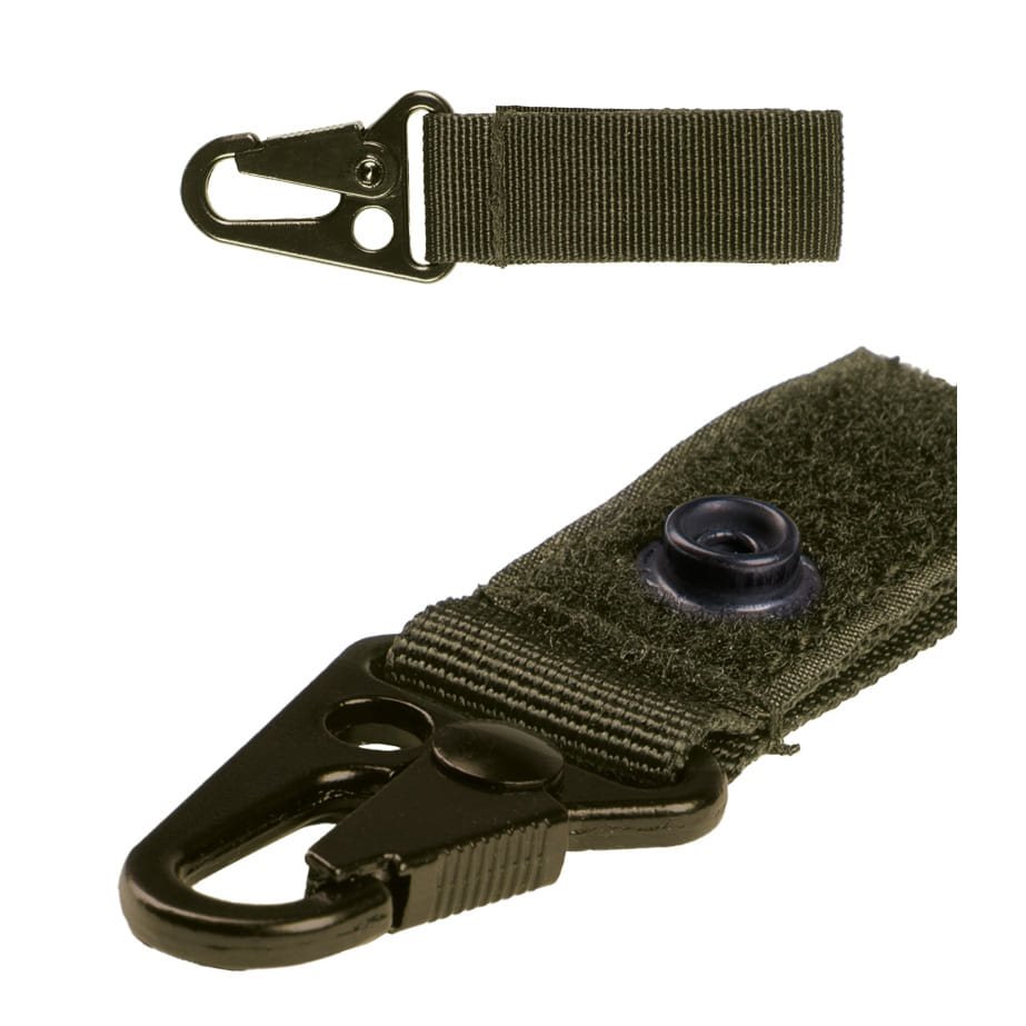 Moschettone metallico su cinturino, che può essere agganciato alla cintura, al sistema MOLLE dello zaino o del giubbotto, ecc. Per cinture con larghezza massima di 4,5 cm. Chiusura del cinturino con velcro. Larghezza: 2,5 cm, lunghezza compreso il moschettone: 11 cm, moschettone solo circa 4 cm.
