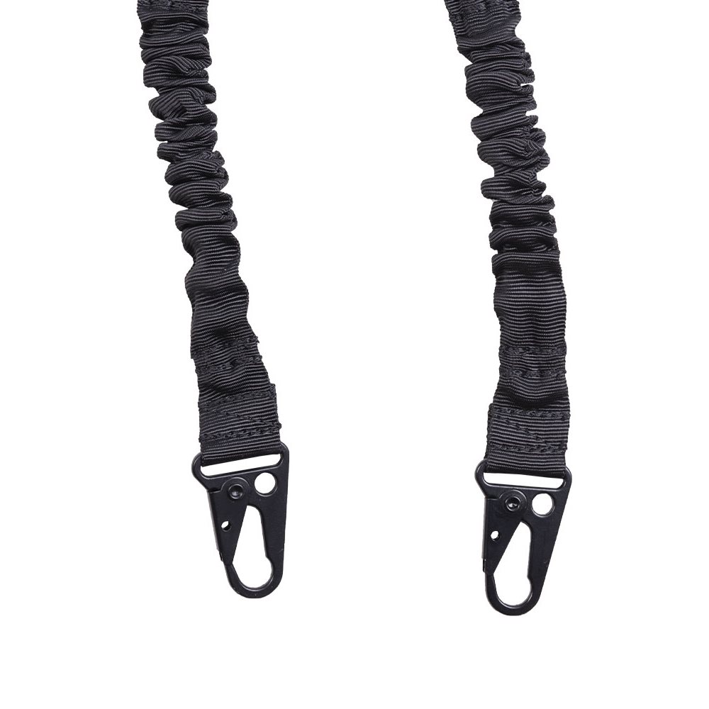 Cinghia regolabile a due punti per armi con sezioni elastiche. Fissaggio dell'arma tramite due moschettoni metallici.
