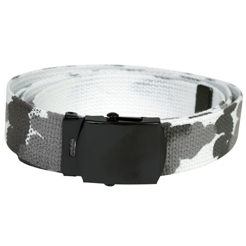 Cintura mimetica in tela con fibbia metallica nera. Modello double-face: da un lato mimetico, dall'altro tinta unita nel colore corrispondente.
