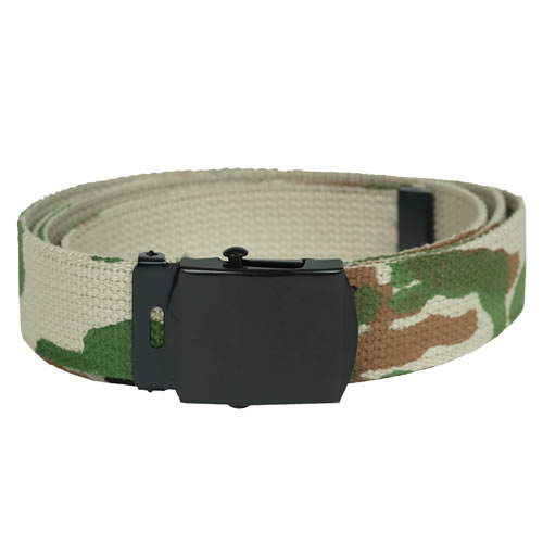 Cintura mimetica in tela con fibbia metallica nera. Modello double-face: da un lato mimetico, dall'altro tinta unita nel colore corrispondente.