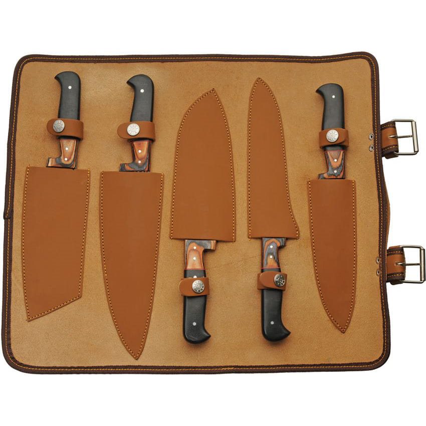 Set di cinque coltelli che ogni cuoco apprezzerà. I coltelli sono realizzati in acciaio damasco e forniti in un astuccio in similpelle.