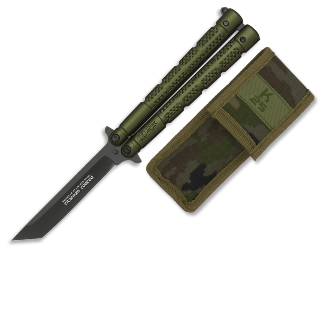 Coltello pieghevole in metallo, denominato "a farfalla", prodotto dall'azienda spagnola K25. Ulteriori informazioni