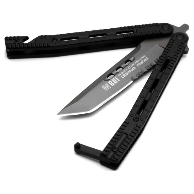 Coltello pieghevole in metallo, denominato "a farfalla", prodotto dall'azienda spagnola RUI Tactical. Ulteriori informazioni