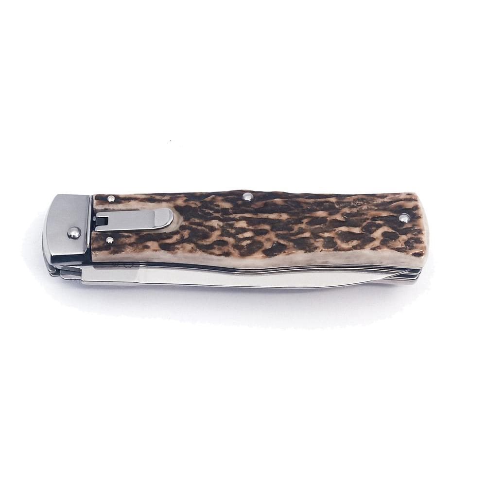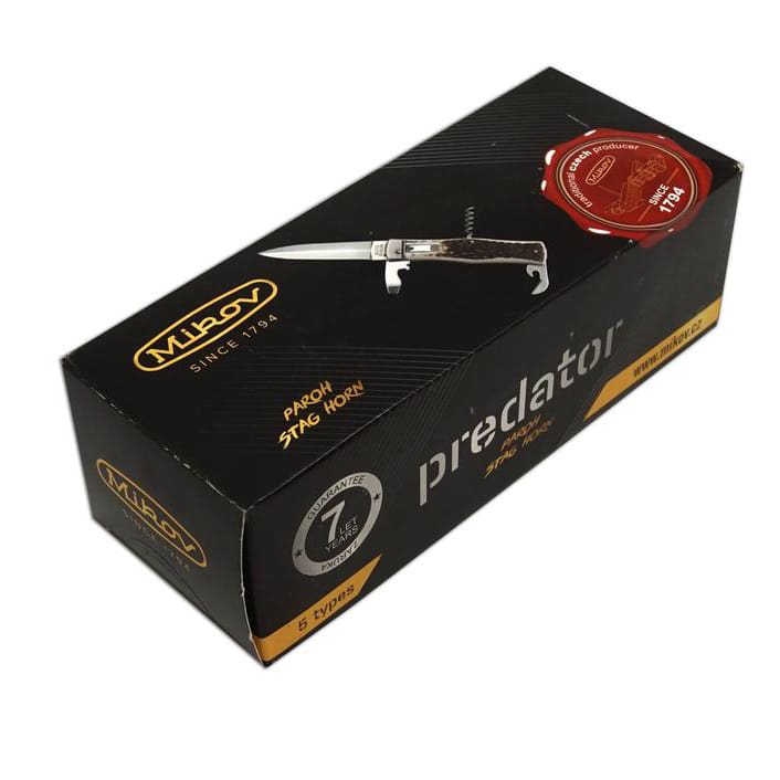 Il coltello PREDATOR è un coltello automatico a scatto prodotto dalla ditta Mikov, con sede nel cuore della Svizzera ceca, nella città di Mikulášovice. Uno dei numerosi vantaggi del coltello PREDATOR è che può essere aperto rapidamente con una sola mano. La lama del coltello è realizzata in acciaio inossidabile 420 di alta qualità con una durezza di 52-55 HRc. Il manico del coltello è realizzato in vero corno di cervo, molto apprezzato dai cacciatori e dagli amanti della natura. La sua forma garantisce non solo una presa comoda e salda, ma impedisce anche che la mano scivoli e si ferisca. Il coltello ha un design elegante e raffinato.