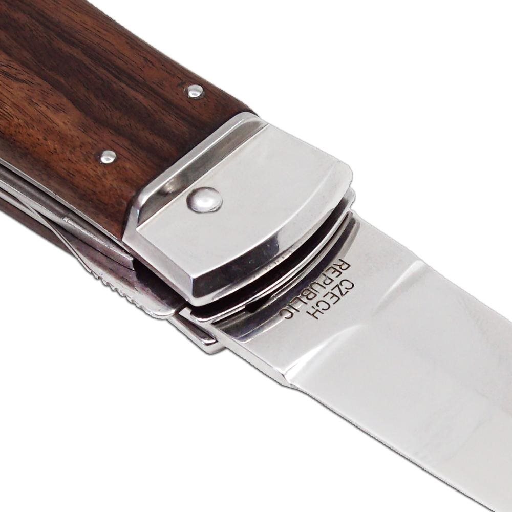 Il coltello PREDATOR è un coltello a serramanico automatico prodotto dalla ditta Mikov, con sede nel cuore della Svizzera ceca, nella città di Mikulášovice. Uno dei numerosi vantaggi del coltello PREDATOR è che può essere aperto rapidamente con una sola mano. La lama del coltello è realizzata in acciaio inossidabile 420 di alta qualità con una durezza di 52-55 HRC. Il manico del coltello è realizzato in pregiato legno esotico PALISANDER SANTOS. La sua forma garantisce non solo una presa comoda e salda, ma impedisce anche che la mano scivoli e si ferisca.