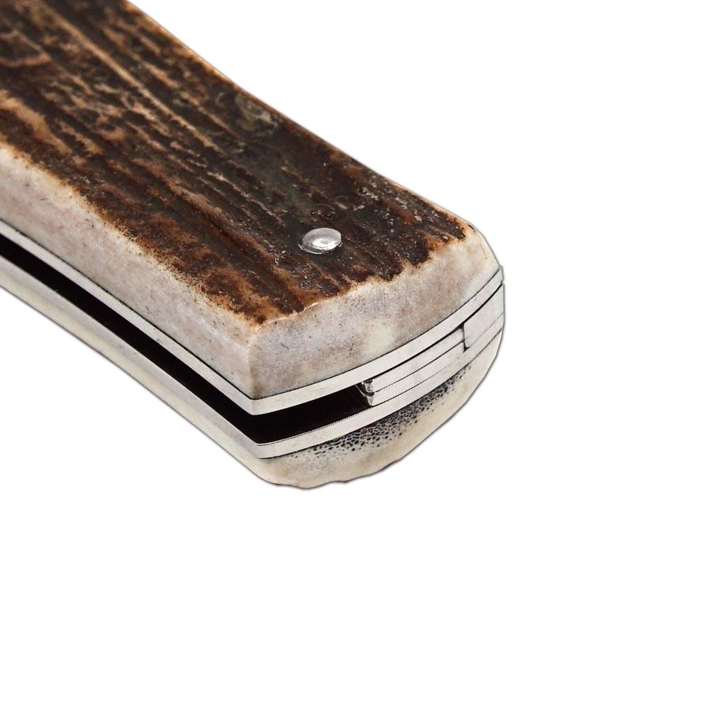 Il coltello presenta una decorazione sul dorso e sulla parte superiore della lama. Il manico del coltello è realizzato in vero corno di cervo, molto apprezzato dai cacciatori e dagli amanti della natura. La sua forma garantisce non solo una presa comoda e salda, ma impedisce anche che la mano scivoli e si ferisca. Questo PREDATOR è prodotto solo in versione monopezzo e viene fornito con un lussuoso fodero in pelle con passante per cintura.