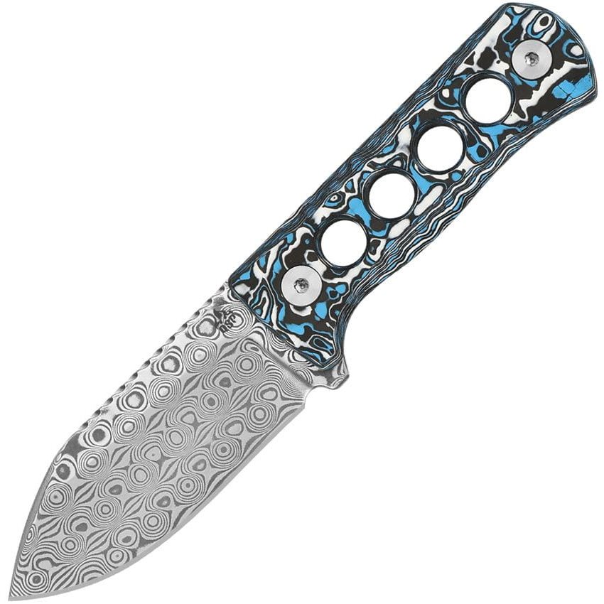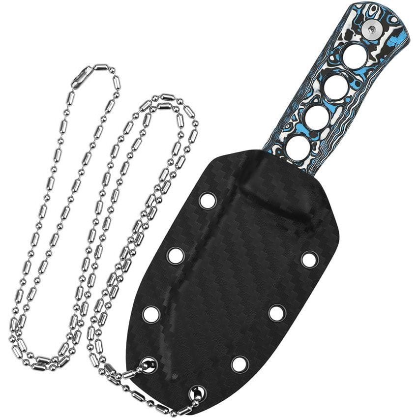 Leggerissimo coltello EDC con struttura full-tang progettato per essere indossato al collo. La lama con filo liscio è realizzata in acciaio damasco con un motivo molto pronunciato. Il manico è piacevolmente sagomato per adattarsi bene alla mano ed è realizzato in fibra di carbonio in una combinazione di colori bianco, rosso e blu. Il coltello è fornito con un fodero in kydex nero abbinato con una catena metallica da collo.