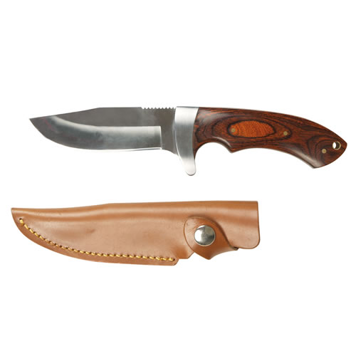Lunghezza totale 23 cm, lunghezza lama 10 cm. Manico in legno, fodero in pelle.