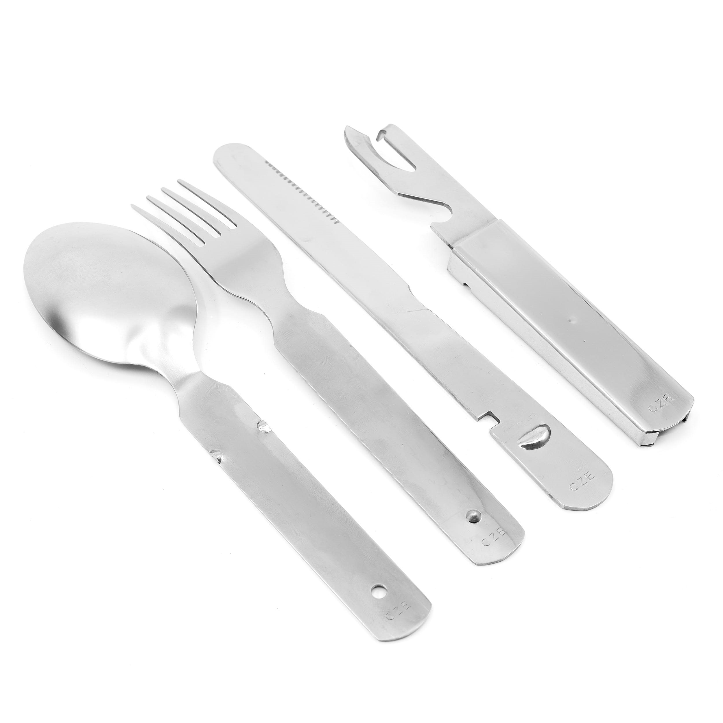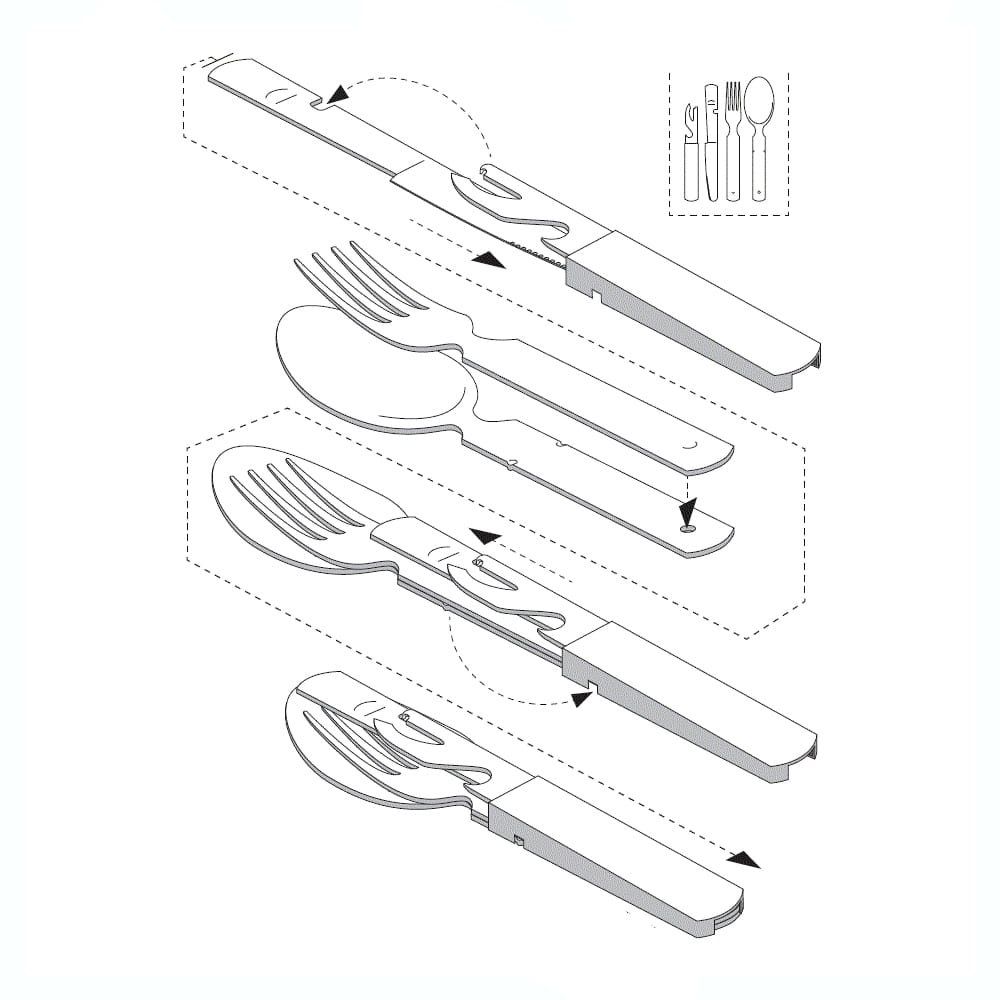 Il set di posate da campo pieghevole CZ ARMY in quattro pezzi è composto dai seguenti elementi: cucchiaio, forchetta, coltello e apriscatole universale. I singoli elementi possono essere inseriti l'uno nell'altro.