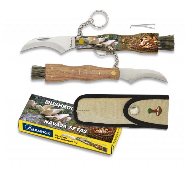 Coltello da tasca pieghevole per funghi con fodero.