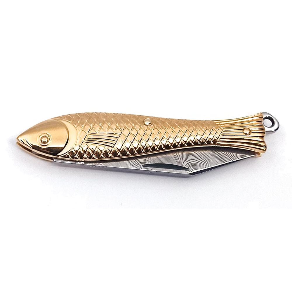 Classico coltellino a forma di pesce in versione da collezione di lusso con lama in acciaio damasco e manico dorato.