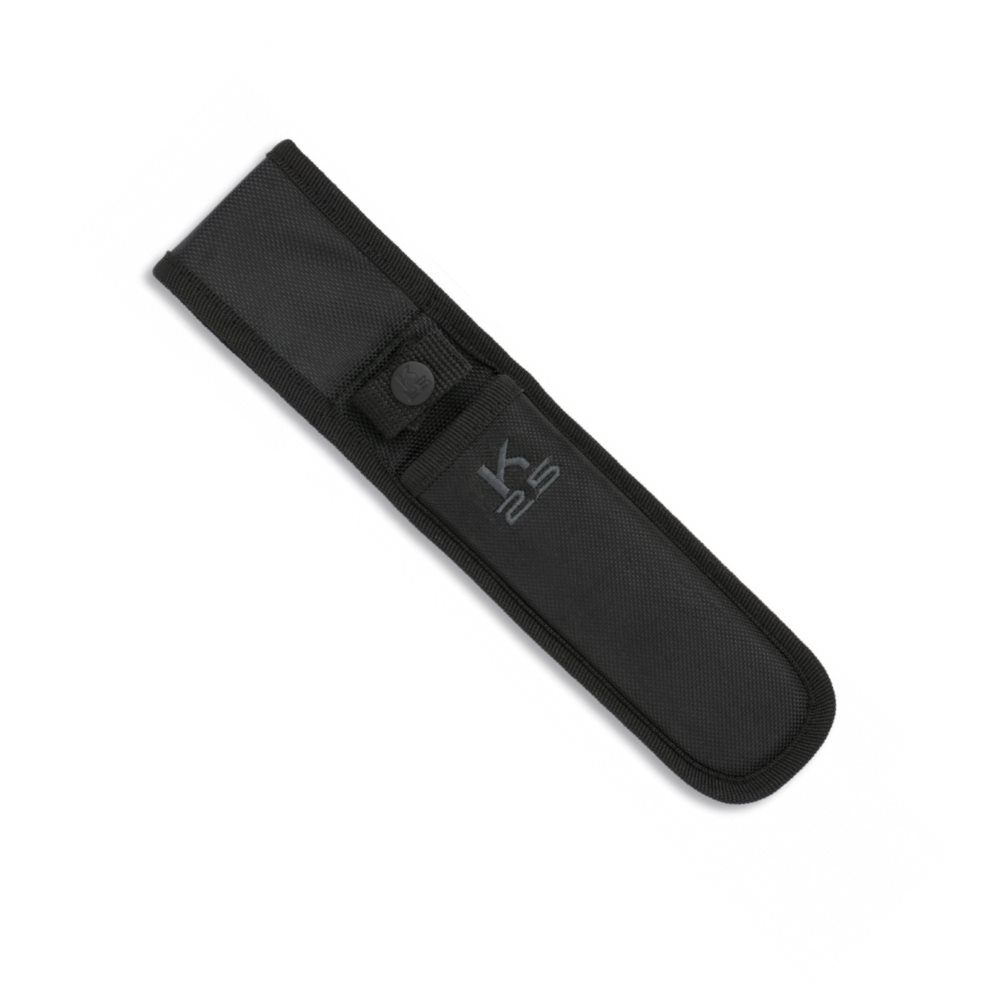 La confezione include una custodia nera in cui il coltello è fissato con una cinghia con chiusura a scatto. La struttura full tang