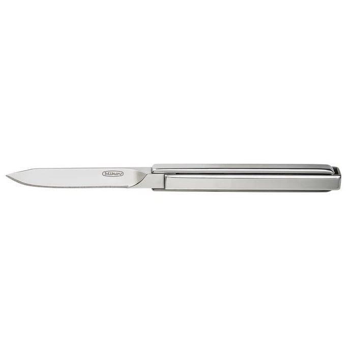 Kostka - un coltello elegante, originale nella forma e nel modo di apertura. La forma squadrata del coltello quando è chiuso ha dato il nome al coltello - Kostka. Può essere classificato nel gruppo dei coltelli a farfalla. La soluzione unica della struttura del coltello appare a prima vista come un interessante rompicapo. Ruotando due volte i manici in acciaio inossidabile di 180 gradi, il coltello viene portato in posizione di pronto uso. Invertendo il movimento, si nasconde la lama a punta centrale. Il manico del coltello è smussato su tutti i bordi per una migliore ergonomia e una presa confortevole. Non solo le signore apprezzeranno la pratica apertura del coltello tramite ribaltamento, che non comporta sforzi o danni alle unghie. Kostka è un coltello pratico e maneggevole, un elegante compagno da portare con sé. Grazie alle sue dimensioni, sta in qualsiasi tasca o borsetta.