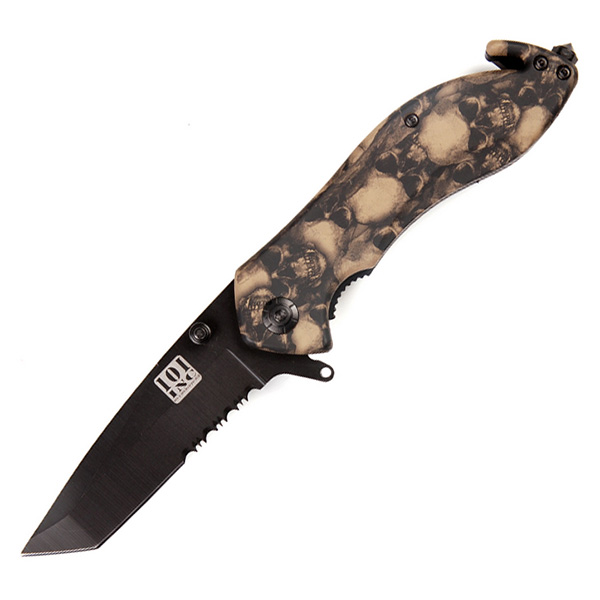 Coltello pieghevole interamente in metallo con lama di tipo tanto, doppio taglio, rompivetro, taglierina per nastri e clip per il fissaggio alla cintura. Motivo a teschi sui manici.
