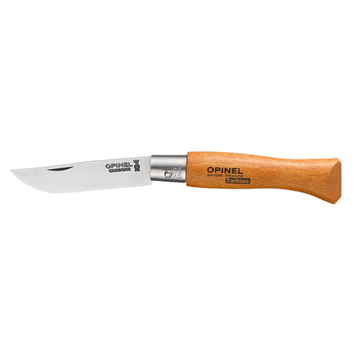 L'acciaio al carbonio Opinel è un acciaio non legato ad alto tenore di carbonio che, dopo il trattamento termico, acquisisce un'eccellente durezza che garantisce un perfetto mantenimento del filo, una grande resistenza all'usura e una facile riaffilatura. Tuttavia, l'acciaio al carbonio, con la sua bassa resistenza alla corrosione causata dall'umidità, richiede alcune precauzioni: si raccomanda di non lasciare il coltello in un ambiente umido, in particolare nella lavastoviglie, e di pulire la lama con un panno oleato dopo l'uso, lubrificandola frequentemente, così come il suo snodo.