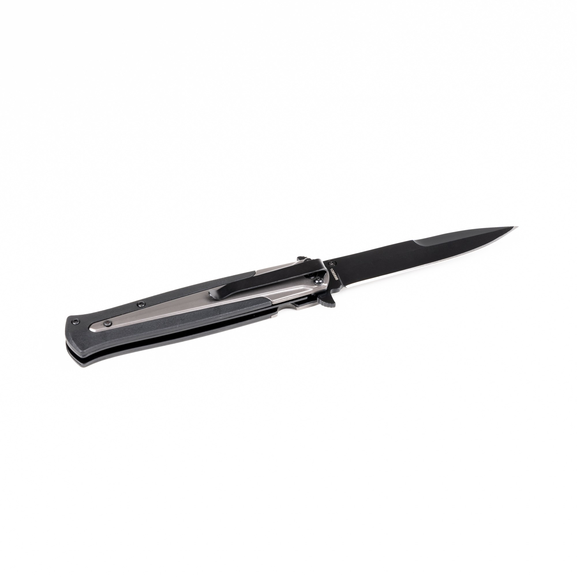 Coltello pieghevole dall'aspetto simile a un pugnale. Lama liscia su un lato. Il manico in acciaio inossidabile grigio con inserti in nylon conferisce un aspetto leggermente industriale. Perno sulla lama per aprire il coltello con una sola mano. Il manico è dotato di una clip metallica da tasca. È presente anche un fermo LinerLock, che impedisce la chiusura accidentale del coltello.