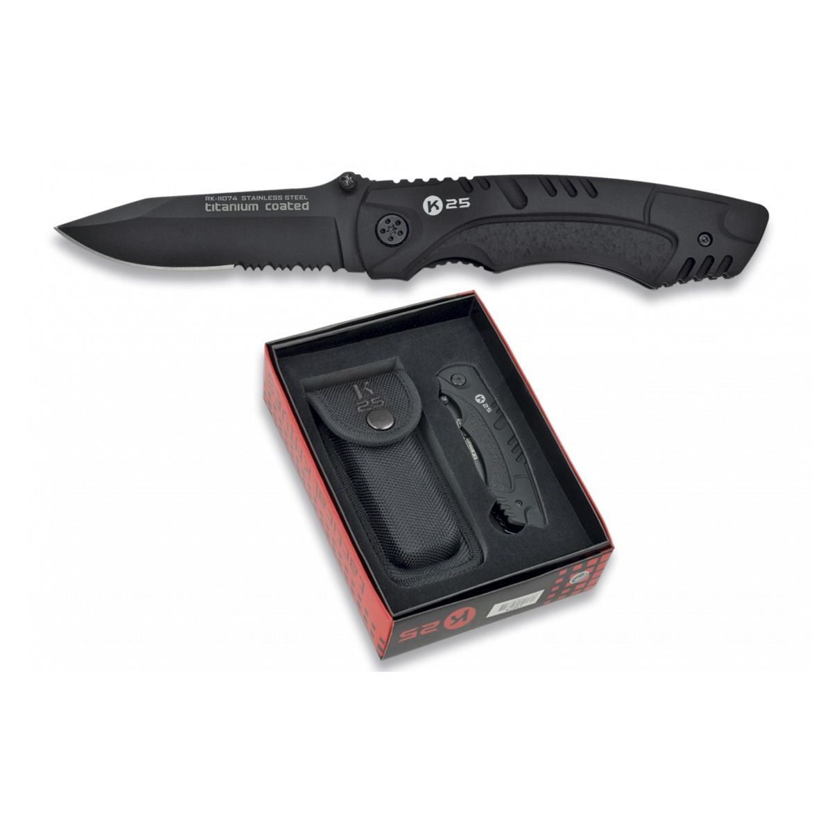 Piacevole coltello tascabile 11074 del produttore spagnolo K25. Grazie al manico gommato in materiale SFL (Rubber Coated), il coltello si adatta perfettamente alla mano e offre una buona presa. Apertura tramite perno nella lama e blocco LinerLock. Include un fodero in nylon rigido.