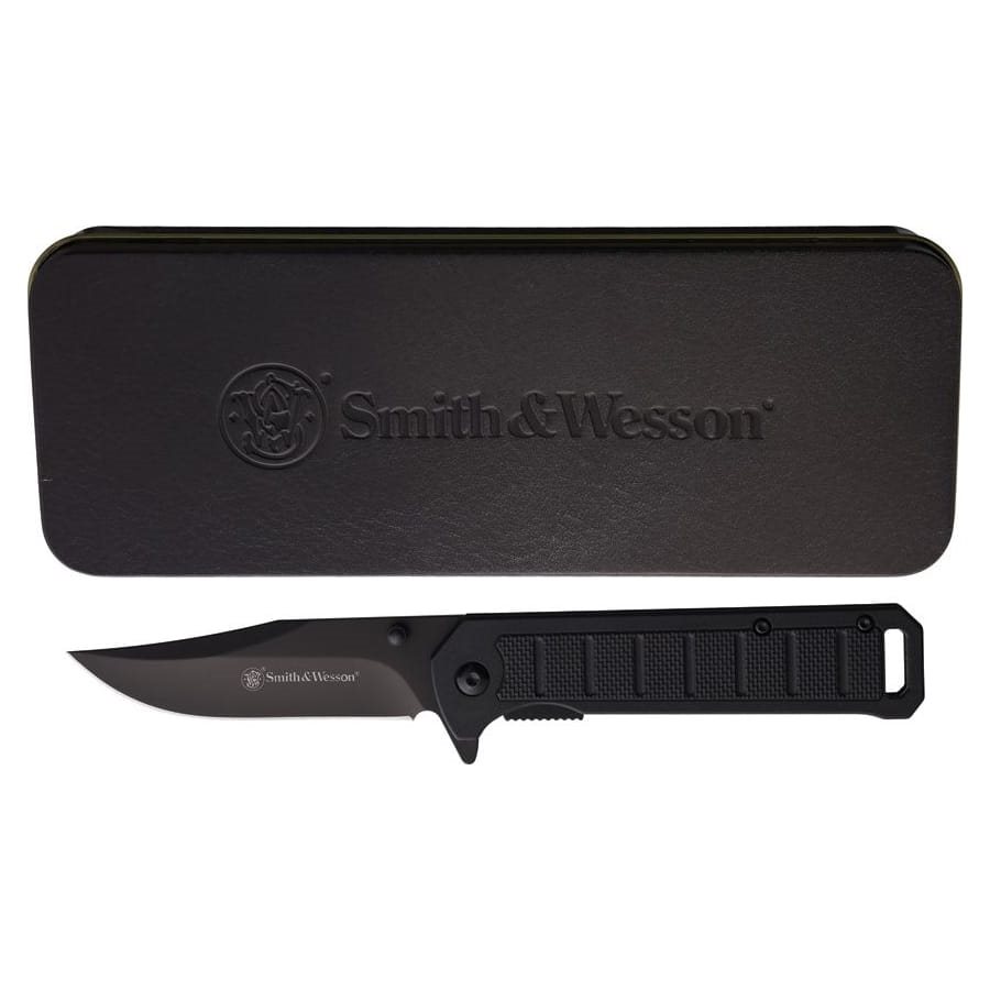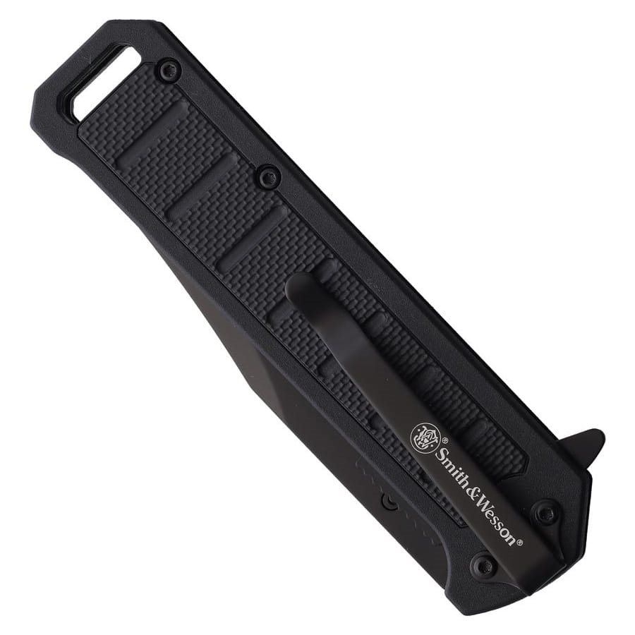 Semplice coltello pieghevole con apertura assistita, fornito in una confezione regalo con il logo del produttore Smith & Wesson. La lama clip point di colore nero con filo liscio è realizzata in acciaio inossidabile e dispone di un perno su entrambi i lati e di un flipper per una facile apertura con una sola mano. La sicurezza è garantita da un affidabile blocco di sicurezza di tipo Linerlock. Il manico si allarga leggermente verso l'estremità e le sue guancette sono realizzate in nylon resistente con impugnatura antiscivolo. L'estremità del manico è dotata di un foro per il passaggio del cordino di sicurezza e dispone di una clip da tasca in metallo.
