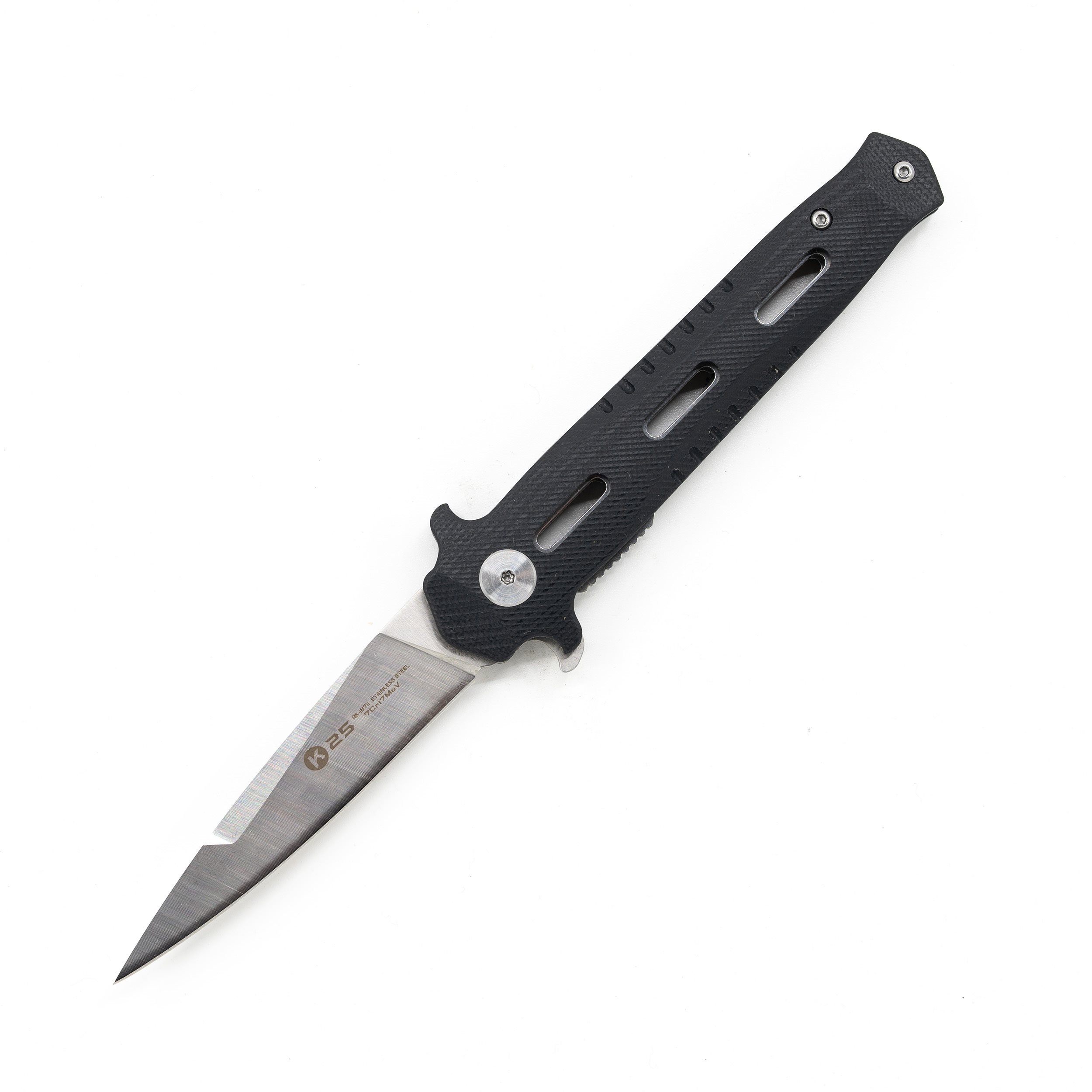 Coltello tattico adatto per l'uso quotidiano EDC. La lama stretta con bordo liscio è realizzata in acciaio inossidabile 7Cr17Mov con finitura satinata CNC. Quando è aperta, la lama è bloccata da un affidabile fermo LinerLock e per facilitarne l'apertura il coltello è dotato di un flipper. Il manico è perforato al centro ed è stato realizzato in resistente materiale G10 di colore nero. Fornito con fodero in nylon di colore nero.
