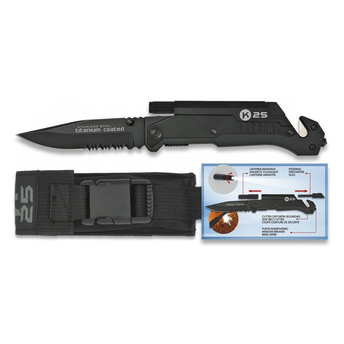 Eccellente coltello di soccorso del marchio K25. La lama è realizzata in acciaio inossidabile con rivestimento in titanio e il filo è liscio. Sul dorso del manico si trovano una pratica torcia a LED e un accendino per situazioni di emergenza. Il manico è costituito da rinforzi in acciaio con guancette in alluminio. Il coltello è fornito con un fodero in nylon di colore nero. Il coltello è adatto a ogni escursionista o avventuriero.