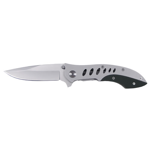 Coltello pieghevole in acciaio inossidabile con impugnatura parzialmente in plastica. Clip per il fissaggio alla cintura.