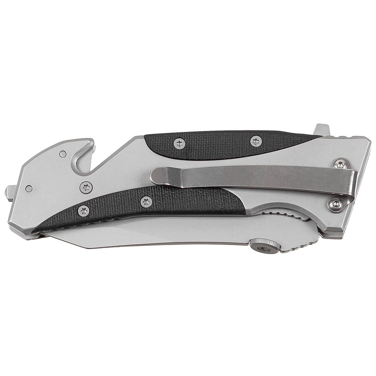 Coltello pieghevole in acciaio inossidabile con manico in metallo e inserti in plastica. Dotato di taglierina per nastri, rompivetro e clip per il fissaggio alla cintura.