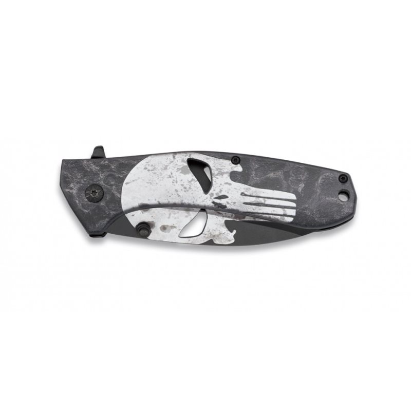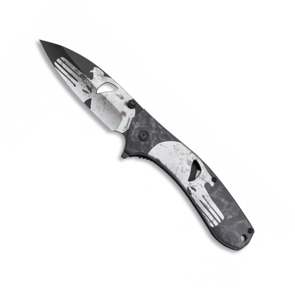 Coltello pieghevole con stampa di un teschio (punisher), in cui gli occhi del teschio formano delle aperture, sia nel manico che sulla lama.