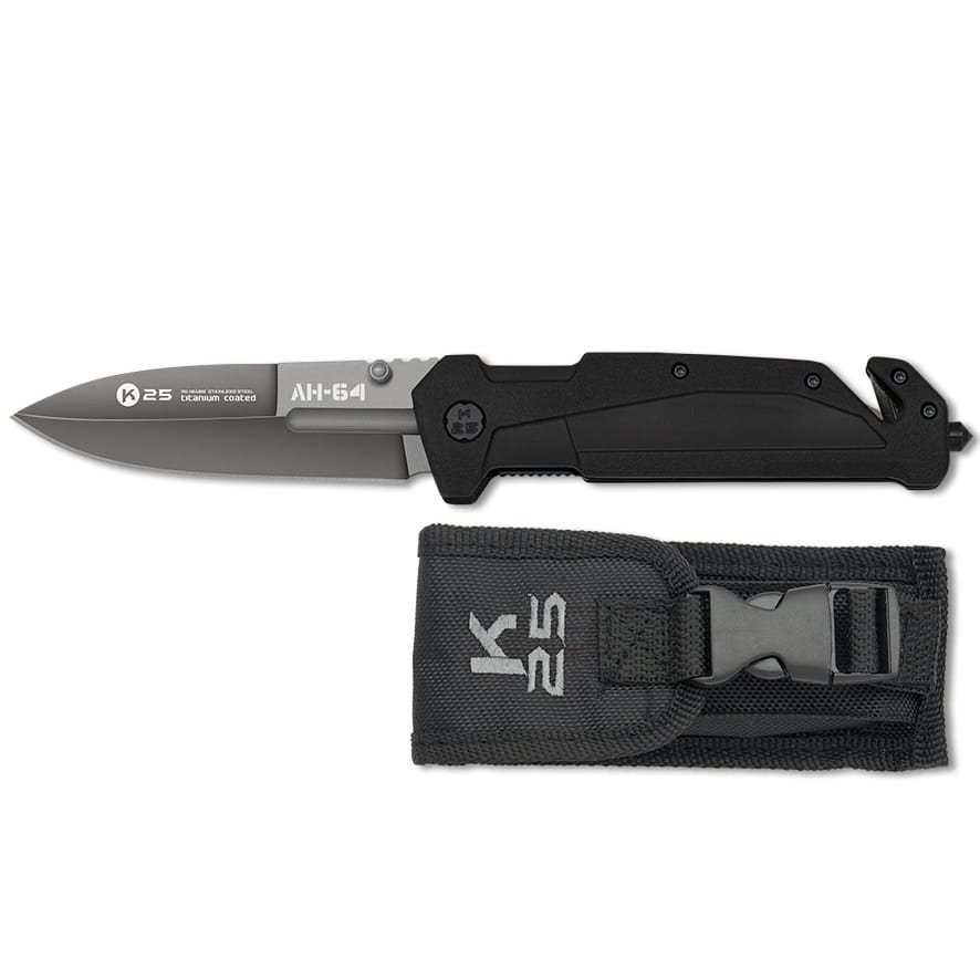 Coltello tattico con diversi elementi di soccorso, il cui design è ispirato agli ormai leggendari elicotteri AH-64 APACHE. La lama con filo liscio è realizzata in acciaio inossidabile 3Cr13Mov con rivestimento in titanio che ne migliora le proprietà e la resistenza meccanica. Per una facile apertura con una sola mano, è possibile utilizzare il perno bilaterale sulla parte superiore della lama. Una volta aperto, il coltello è bloccato da un fermo Linerlock. Per la produzione del manico è stata utilizzata gomma con eccellenti proprietà antiscivolo. All'estremità del manico si trovano un taglierino di emergenza e una punta in tungsteno per rompere il vetro. Il coltello è dotato di un fodero in nylon da cintura con chiusura in plastica.
