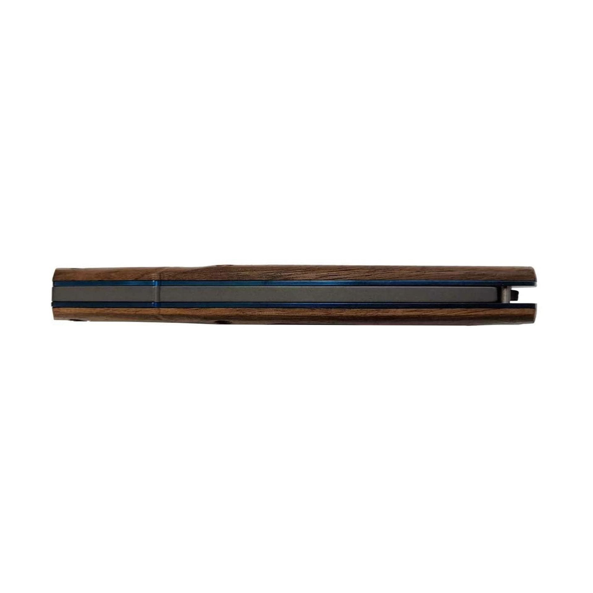 La serie di coltelli Blue Wood Knives si distingue per l'elevata qualità della lavorazione. Le lame sono realizzate in acciaio 440 C titanizzato grigio, mentre i manici in legno di noce garantiscono una lunga durata dei coltelli. La lama è fissata da un perno, mentre una vite universale nera consente di regolare la rigidità di apertura. La confezione include un fodero in pelle. blocca la lama, mentre la vite universale nera permette di regolare la rigidità di apertura. La confezione include un fodero in pelle che consente di trasportare il coltello in modo sicuro. Materiali di alta qualità, chiusura di sicurezza SlipJoint, design leggero.